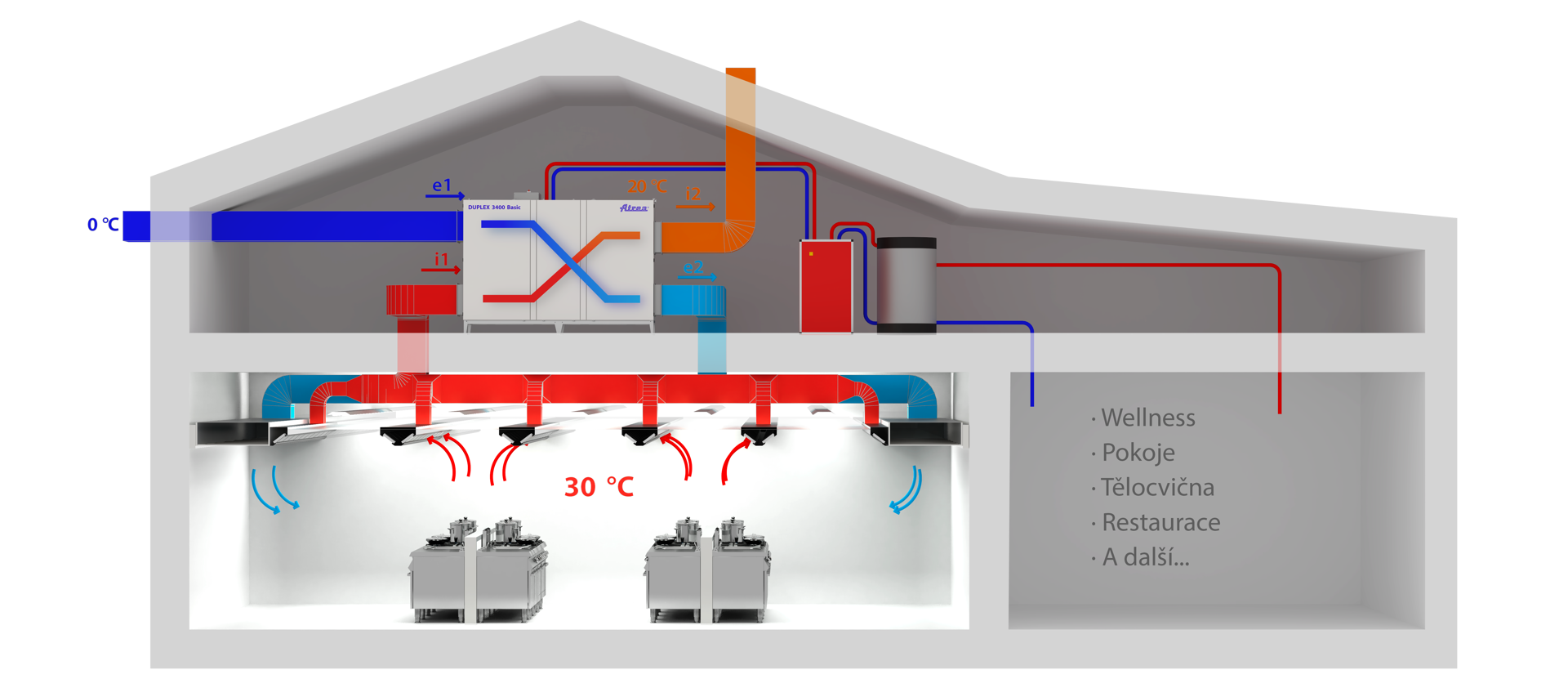 - v létě chladí vzduch – možnost „ostrého“ ochlazování nástěnnými konvektory s vodou o teplotě 10 °C – zajišťuje vyšší účinnost a levnější provoz než u klimatizace
