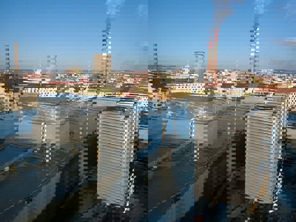 Polyfunkční dům Felicidad na rušné ulici Křenová v centru Brna. Zdrojem vytápění jsou tři splitová tepelná čerpadla vzduch – voda Easy Master 75 Z, zapojená do kaskády o celkovém topném výkonu 91 kW (A7W35). Dům je vybaven podlahovým topným systémem, který přispívá k vysoké účinnosti vytápění a rychlé návratnosti investice. Strojovna je umístěna v nejvyšším patře budovy a venkovní jednotky na ploché střeše.
